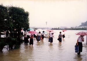 ※台風の影響で学校周辺が大雨のため腰の辺りまでの大水になっていて、その中を登下校している写真が残されていました。たぶん昭和60年の頃かなと思うのですが、その大水の中、登下校した記憶のお持ちの方、探しております。同窓会までEメールを下さい。 |