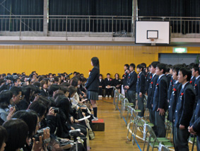 | 校長先生は、卒業のお祝いを言われたあと、「皆さんは20世紀の終わりに生まれました。20世紀初頭から中頃までは、日本はまだ開発途上にあり、物理的にも貧しい社会でしたが、20世紀後半から21世紀の今、日本は経済成長を遂げ、大きく発展してきました。皆さんは、大変豊かな頃に生を受け、現在に至っている訳です。ところが、最近、その豊かさも永遠に続くものではない事象が世界中で起きています。皆さんもよく知っているように、米国の金融危機に端を発した世界中の経済不況です。日本でも、雇用や失業の問題、大企業の大きな赤字、企業の倒産、日本経済のマイナス成長が心配されています。ノーベル平和賞を受賞し、インドで活動して数年前に亡くなられたマザーテレサを知っていると思います。彼女は、このように言っています。「経済先進国には、貧困以上の心の飢餓・貧しさがある。」と。物理的な豊かさを否定するものではありませんが、忘れてならないのは、精神的な豊かさです。お金さえあれば何でもできるという拝金主義や、自分さえよければいいという利己的な考え方、さらに、額に汗して働くことを否定し、楽に楽しく、好きなことだけやり、気楽に生きていきたいという考え方ではなく、「真心をもって人と接する。地道に努力する。」「人のために役立つことをする。」「家族はもちろん、友達など自分の周囲の人を大切にする。」「自然や周囲の人、いろいろなことに感謝する。」などが今必要です。このことは難しいことではなく、よく考えれば当たり前のことだと思います。私たちは、幸せの種に気付いていない、人間にとって本当に大切でおかすことのできないことは尊厳=精神的な豊かさであるということをマザーテレサは言ったのだと思います。どうか、卒業生の皆さんは、自分の持っている良さを発揮し、自己の良心に恥じない生き方を求める中で、人間としての誇りと自覚を持ち、「真の豊かさを求めてほしい」と願っています。」と話されました。 |